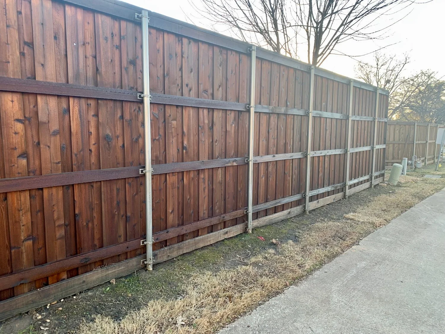 In the DFW area, recommend restaining every 4-5 years for vertical fences like privacy fencing to maximize longevity—especially with cedar or pine. Cedar is naturally more rot-resistant and withstands warping better than pine, but both benefit from regular protection against UV, heat, and storms. Full-sun exposures (common in Frisco and surrounding suburbs) may show wear sooner, so watch for signs.